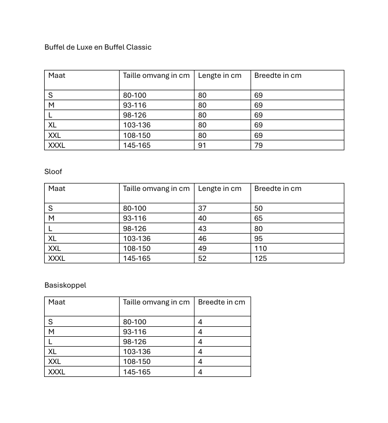 De juiste maat kiezen? In deze tabel vindt u alle afmetingen voor schorten, sloven en basic belts.